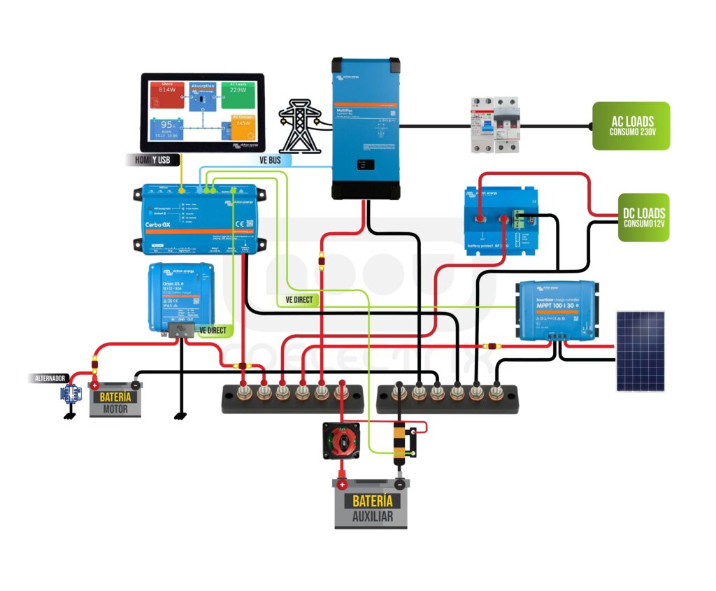 - Distribución principal / consumos grandes: busbar 300A (más margen, hardware más robusto) con inversores de hasta 3000w (como referencia)